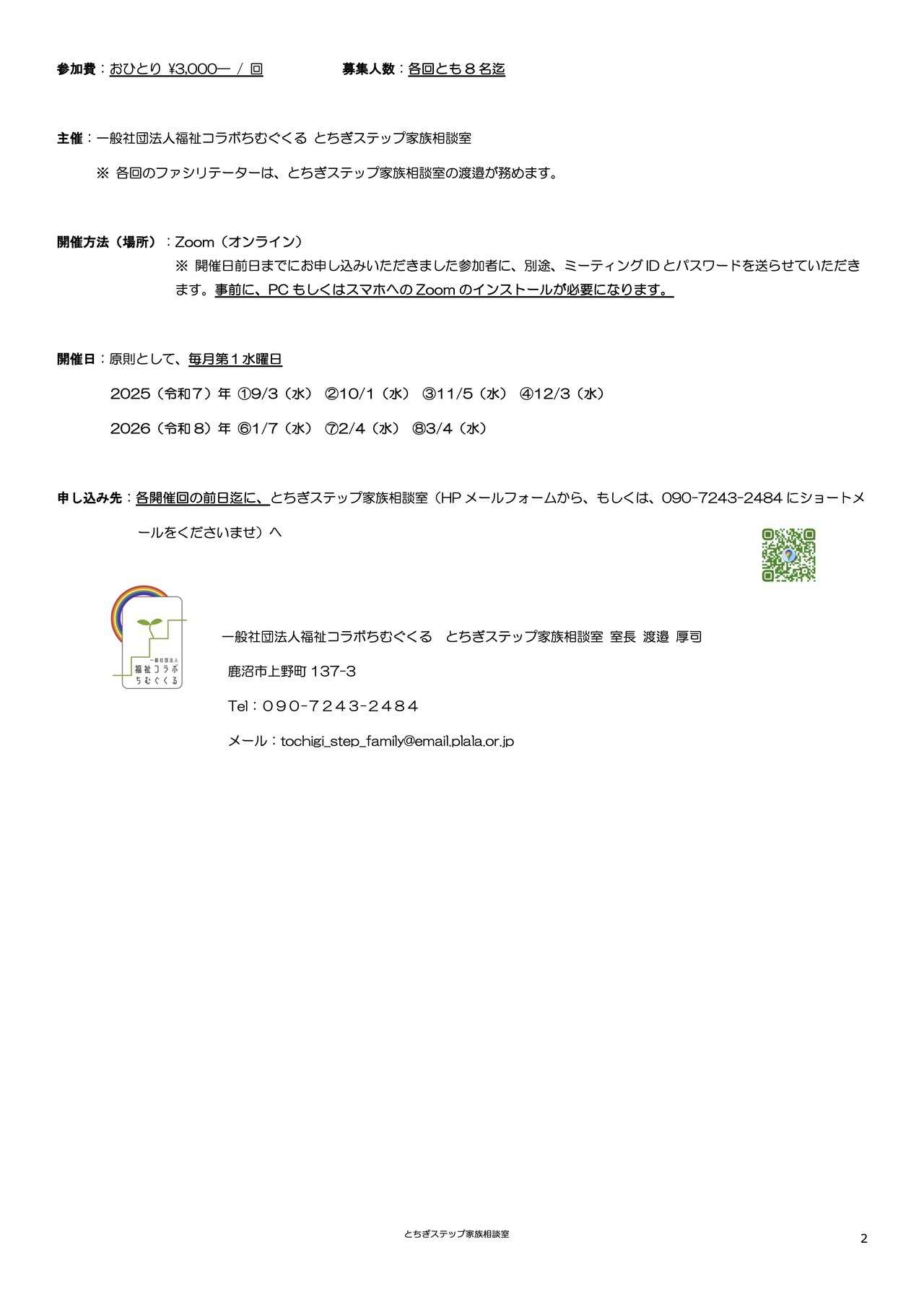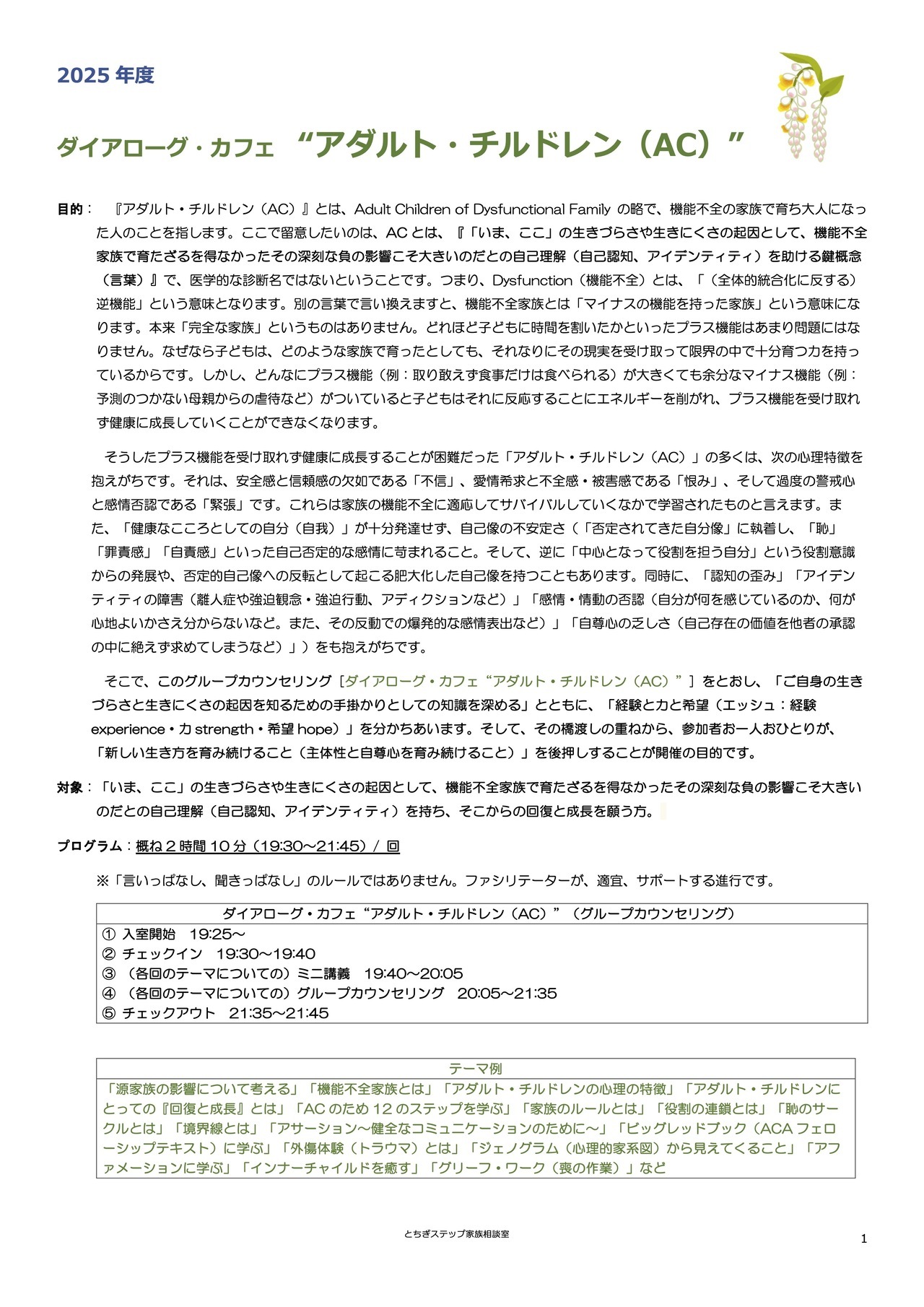 (2)4/1(水)19:30〜21:45、「2025年 第8回 ダイアローグ・カフェ “アダルト・チルドレン(AC)”」という呼び名のグループカウンセリングをオンライン(Zoom)で開催いたします。 テーマは、「ジェノグラム(心理的家系図)から振り返る“わたし”<その2>」です。